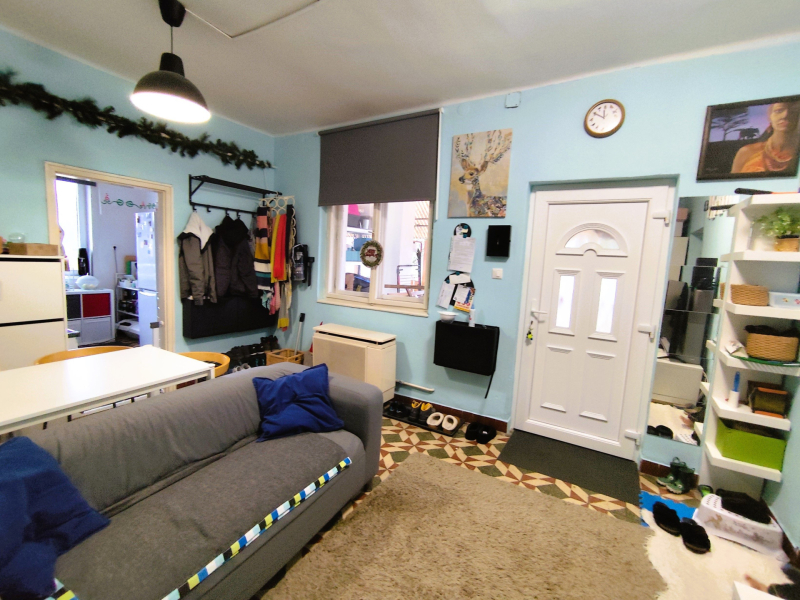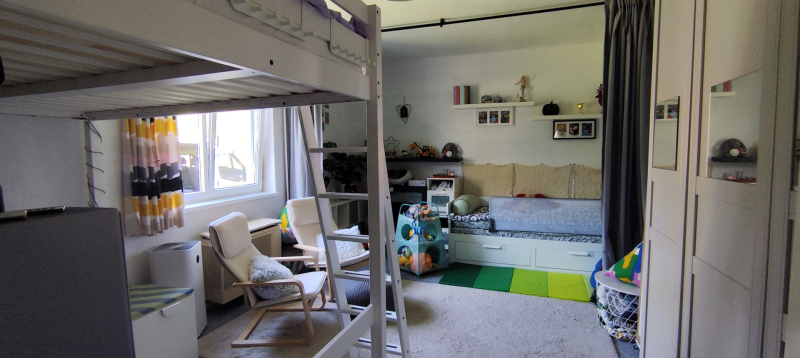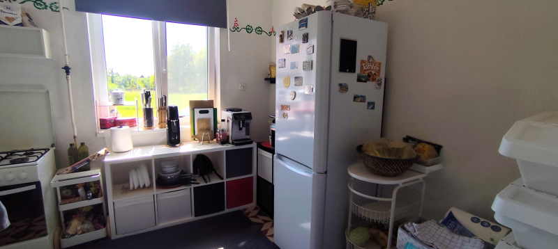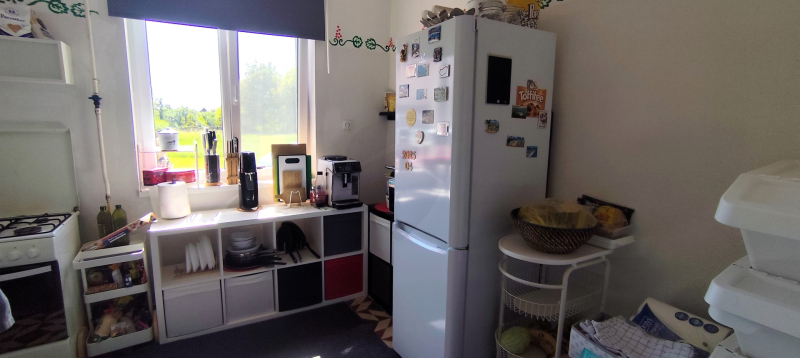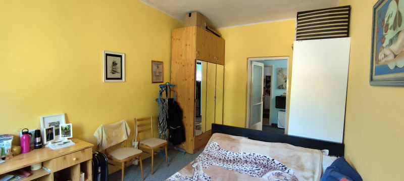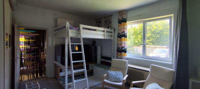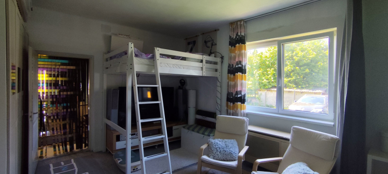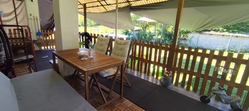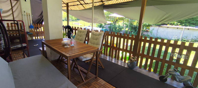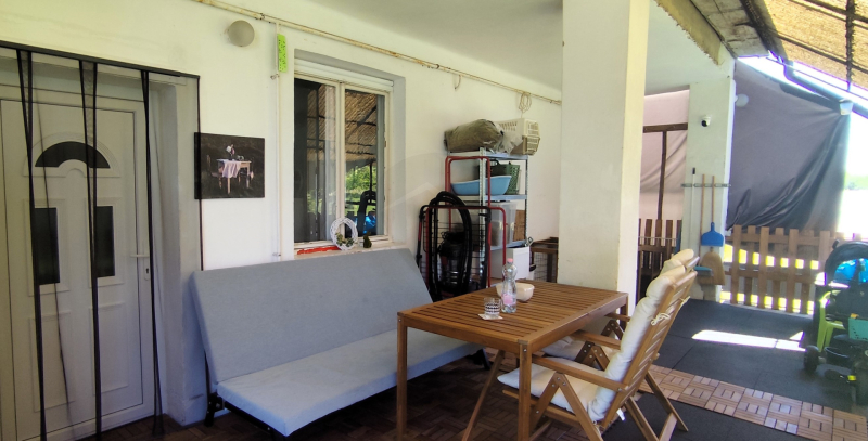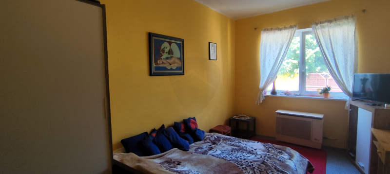 Az 1980-ban, 38 cm-es ikersejt téglából épült házban nappali (16 m²), két tágas szoba (21,8 és 16,7 m²), fürdőszoba WC-vel, konyha (9,3 m²), kamra és egy fedett terasz (24 m²) valamint kis pince található. A bejárat nagyméretű teraszon keresztül közelíthető meg. A helyiségek elrendezése praktikus, a nappaliból balra nyílnak a hálószobák, szemben a fürdőszoba található, míg jobbra a konyha és a hozzá tartozó spejz, ahonnan a padlásfeljáró is elérhető. A TETŐ részlegesen felújításra került cserépfedéssel.