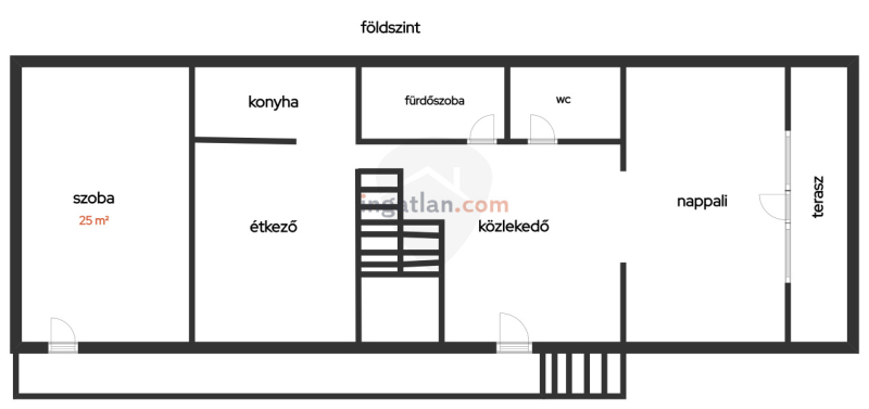A földszinten TÁGAS ELŐTÉR fogad, innen jobbra, az utcafront felé egy NAPPALI nyílik, melyből közvetlen kijárat vezet a TERASZRA.