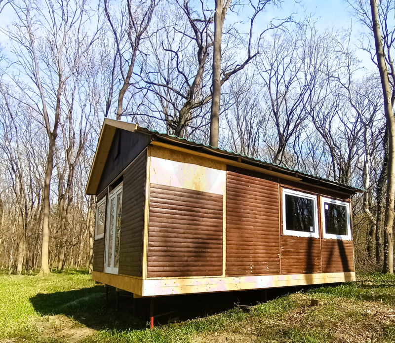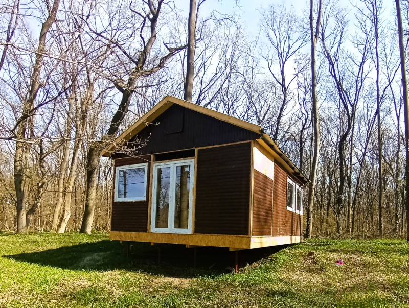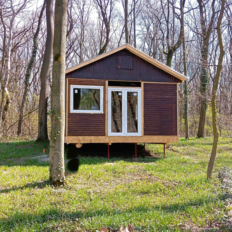 Az egyik 553 m2-es telken cölöpökön álló 32 m2-es faház is felépítésre került, hőszigetelt nyílászárókkal, LINDAB tetőbel. Belső kialakítása folyamatban van. Ennek ára jelenleg 24,9 M Ft, teljes elkészűléskor 30 M Ft.